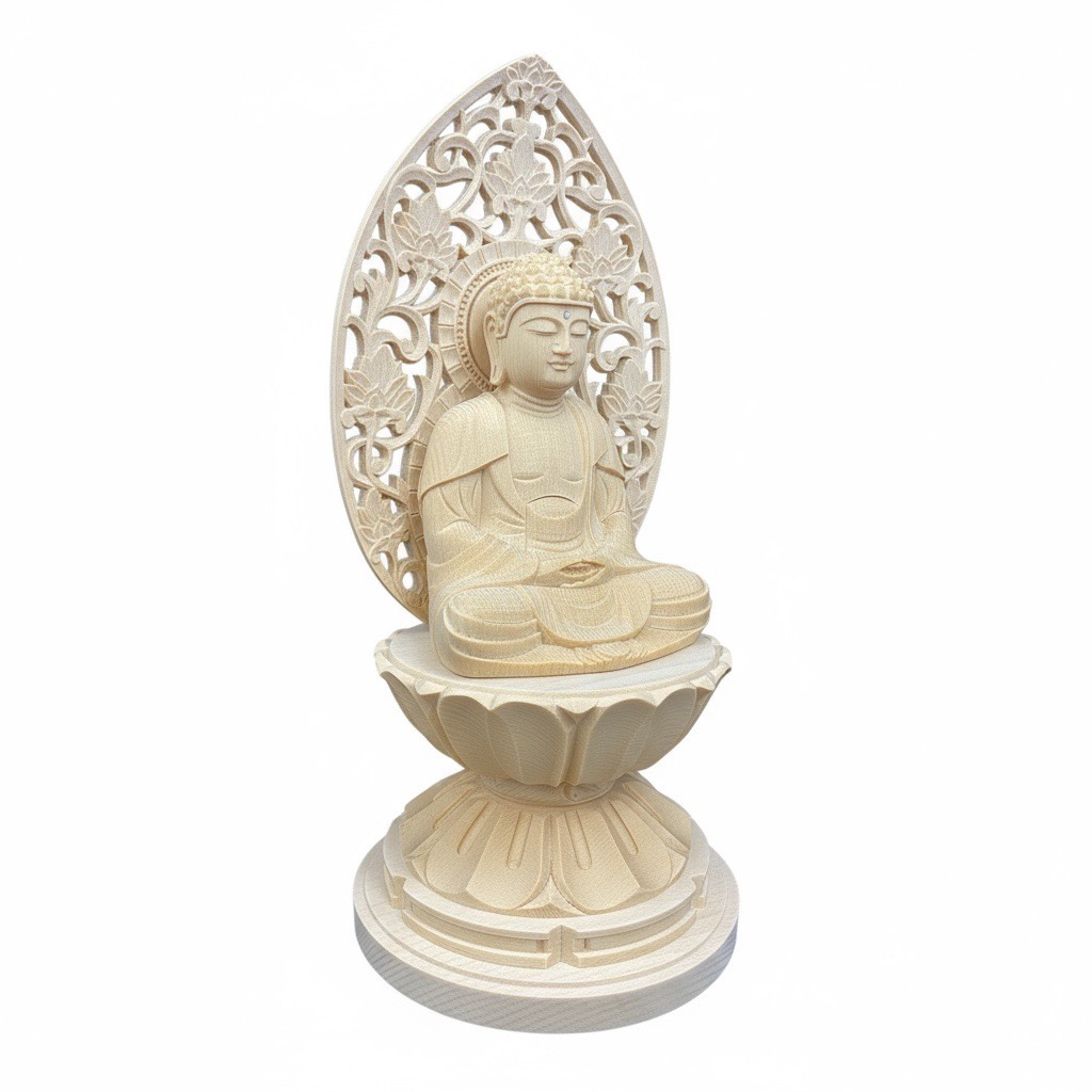 後光の繊細な彫りとお釈迦様の綺麗な顔立ちが美しい商品です。